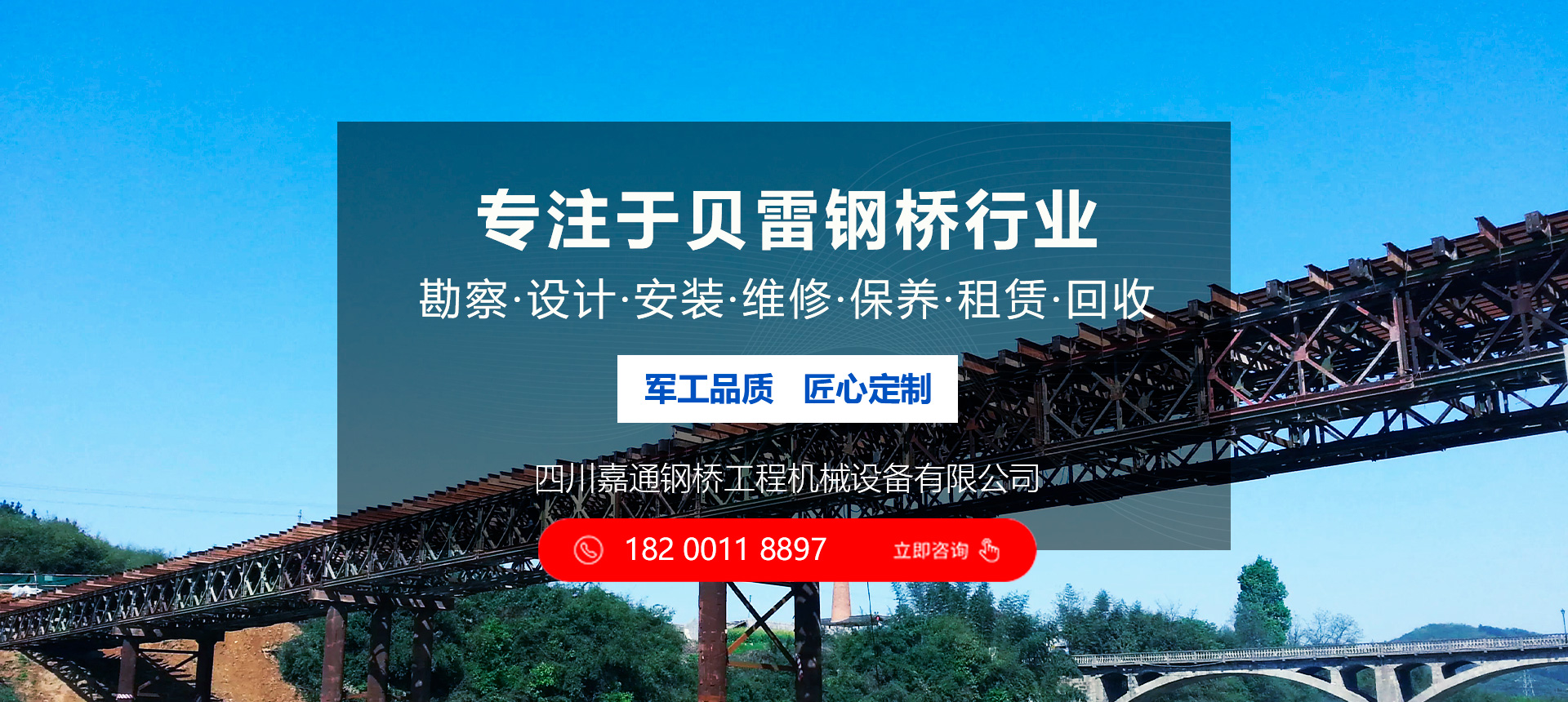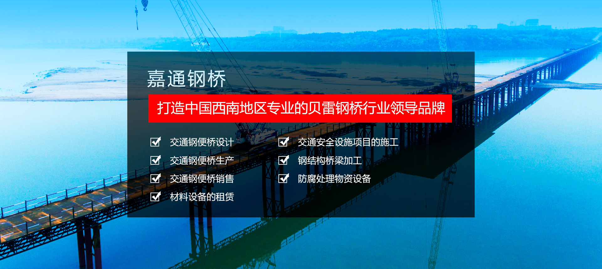 四川嘉通鋼橋工程機(jī)械設(shè)備有限公司坐落于有著天府之國(guó)的成都。以成都為中心,西南.西北和華中市場(chǎng)同步發(fā)展,打造中國(guó)西南地區(qū)專業(yè)的貝雷鋼橋行業(yè)領(lǐng)導(dǎo)品牌。, 主要從事: 交通鋼便橋的設(shè)計(jì)以及生產(chǎn)銷售 材料設(shè)備的租賃 交通安全設(shè)施項(xiàng)目的施工 鋼結(jié)構(gòu)橋梁加工及防腐處理物資設(shè)備等業(yè)務(wù)。   公司堅(jiān)持 “承諾必須兌現(xiàn)、要約必須履行”的誠(chéng)信態(tài)度, “質(zhì)量第一、客戶至上”的經(jīng)營(yíng)理念, 把領(lǐng)先的技術(shù)、卓越的管理和完全以客戶為中心的服務(wù)融為一體,為您提供優(yōu)質(zhì)的產(chǎn)品和完善的服務(wù)。